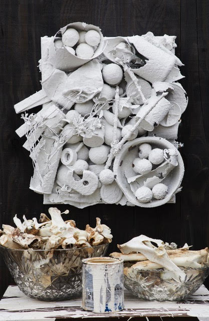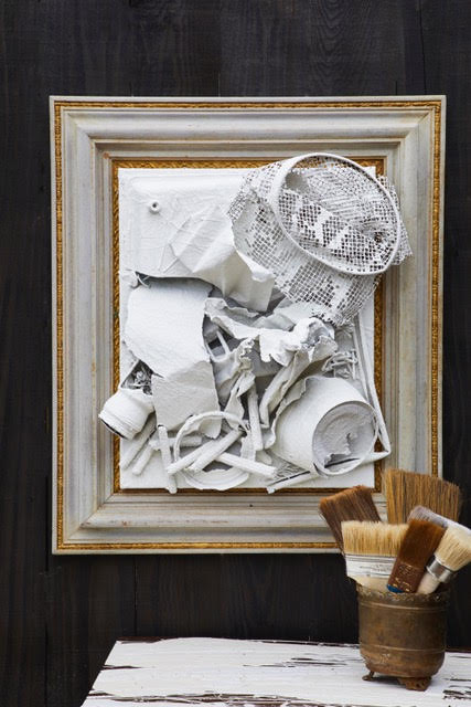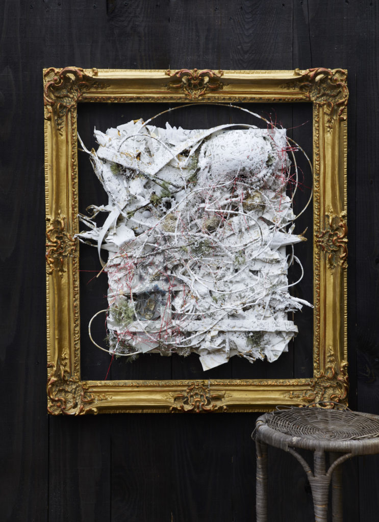 The art exhibition, named “White Trash,” is on display until November 13 and showcases Barnett’s collection of more than 60 works of art made from repurposed materials and found objects. In his signature pieces, Barnett utilizes manmade items — sometimes literally found in the trash — such as paper, chicken wire, makeup, and old cell phones combined with natural objects such as branches, moss, and egg shells. He arranges the objects on canvas and pours white paint over to secure them, giving the pieces their cheeky name.